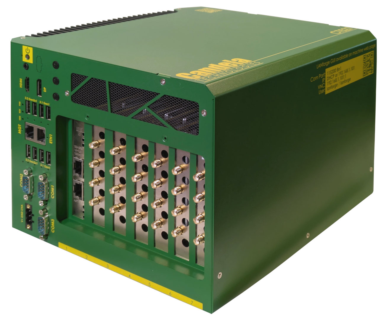 CT527-6w7m4-10g-cu 是一個具有 6組無線卡版的高密度系統,每組卡版同時具有2.4/5/6G三頻的連線能力可以外接天線及SMA纜線做Conducted的測試。整組設備安靜且緊湊適合放在實驗時工作檯上或隨時搬入隔離室(箱)做使用。整體性能在支援超過8Gbps的吞吐量測試,完全滿足Wi-Fi7 320MHz及MLO相關的性能測試需求。使用上可串接用戶端原有的Candela LANforge機箱作為整體測試平台的一部分。